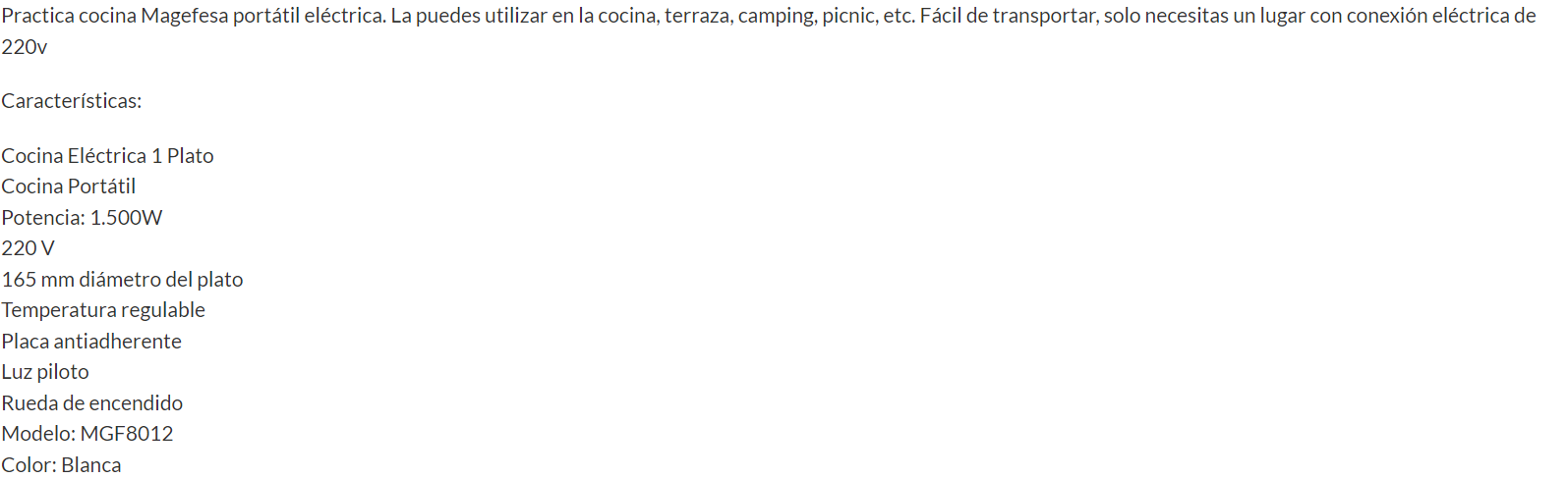 COCINA ELETRICA 1500W 165MM MAGEFESA MAGEFESA Stock por sucursal Stock por sucursal $ 30.920 cantidad Agregar al carro Avísame cuando llegue