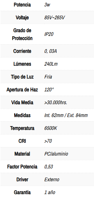Plafón embutido LED circular de 3W, versión de luz fría. Con cuerpo de aluminio de alta calidad. Y un amplio ángulo de apertura para ofrecer una iluminación general con una elevada eficiencia. Posee difusor esmerilado que confiere una iluminación general sin reflejos. Ideal para sustituir a los tradicionales halógenos, llegando a ahorros de hasta el 90% y a plafón embutidos de bajo consumo convencionales. Fácil instalación, larga vida de la luminaria LED, de +30.000 horas y libre de mantenimiento. La solución perfecta para crear un ambiente elegante, en obra nueva o rehabilitación, para el hogar, oficinas, recepciones, museos, bares, entre otros. Cuentan con una garantía de 1 año.