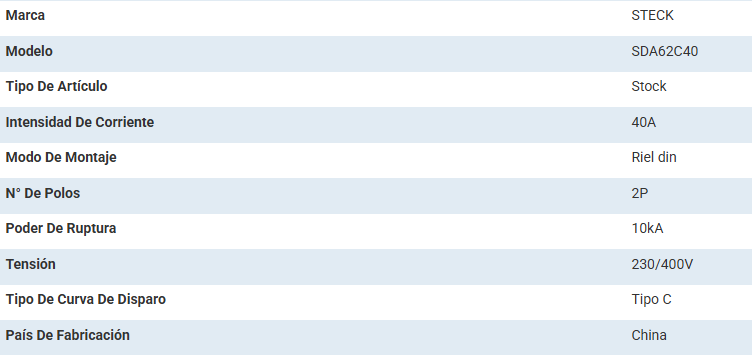 Interruptor termomagnético 2x40A con poder de ruptura de 20kA a 230 VAC según norma IEC 60898 y 10kA a 400VAC, 230/400V curva C DIN.