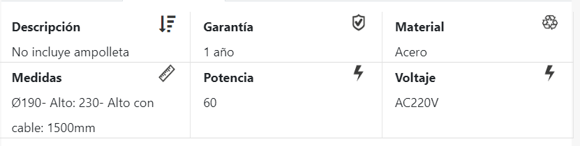 LAMPARA COLGANTE E27 NEGRA E Stock por sucursal Stock por sucursal $ 14.400 cantidad Agregar al carro Avísame cuando llegue