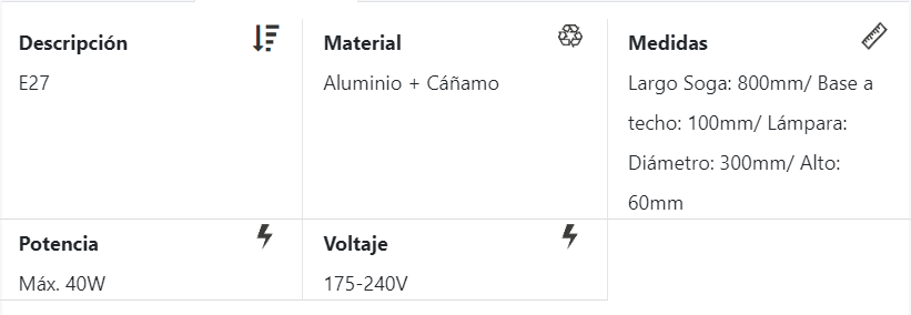 LAMPARA TECHO YUTE CON SOGA Y PORTALAMPARA MOD ACHERN Stock por sucursal Stock por sucursal $ 29.524 cantidad Agregar al carro Avísame cuando llegue