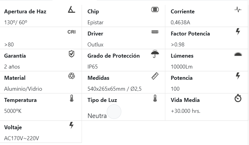 "Luminaria pública 100W, tienen grandes ventajas frente a las luminarias convencionales al no requerir canalizaciones de cables, integran todos los componentes en una sola pieza. Combina todos los últimos avances en tecnología LED, los mejores componentes y los materiales de mejor calidad. Utiliza el driver Outlux, referente en el mercado por su gran estabilidad, del mismo modo, utiliza LEDs Epistar de alta luminosidad. Optimizando la energía acumulada para que esté garantizada la luz durante toda la noche. - Cuerpo realizado en aluminio no corrosivo 100% - Cuenta con certificación SEC y es producto de la línea profesional. - Gran resistencia al agua, polvo e impactos (IP65) - Diseñado para una óptima ventilación de la luminaria. - Disipador con filos redondeados para evitar cortes al manipularlo. - Óptica vial asimétrica longitudinal. - Diseño de lentes que mejora ostensiblemente el flujo luminoso. - Diseño de apertura de clip que hace más fácil las labores de mantenimiento. - Factor de potencia >0.98. "