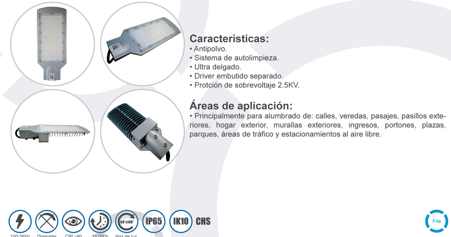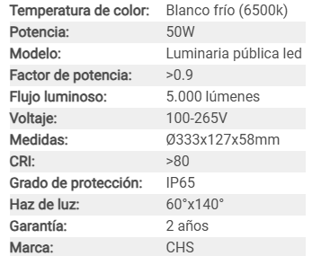 LUMINARIA ALUMBRADO PUBLICO 50w 6500º STREET LIGHT CHS Stock por sucursal Stock por sucursal $ 36.600 cantidad Agregar al carro Avísame cuando llegue