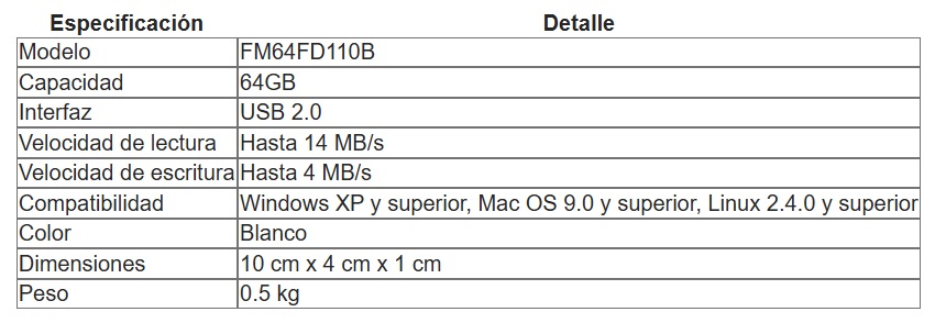 Este pendrive ofrece una capacidad de almacenamiento de 64GB, permitiéndote guardar documentos, fotos, videos y música con facilidad. Su interfaz USB 2.0 asegura una conexión rápida y estable, mientras que su diseño compacto y ligero facilita su transporte. Compatible con diversos sistemas operativos, es una herramienta versátil para tus necesidades diarias de almacenamiento.