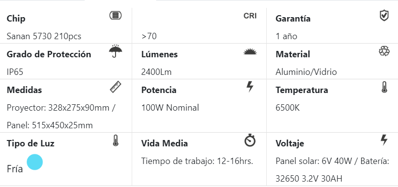 ¿Necesitas iluminación potente y confiable en lugares donde no tienes acceso a la red eléctrica? El proyector solar Rigel 100W es la solución perfecta. Con una potencia de 2400 lúmenes, esta luminaria solar puede iluminar cualquier área de manera eficiente y efectiva. Además, su tiempo de carga es de 5-8 horas y puede funcionar hasta 12-16 horas con una sola carga. Incluso en días nublados y lluviosos, puede durar de 3 a 5 días gracias a su batería de alta capacidad. Olvídate de costosos cables y facturas de luz y aprovecha la energía solar con el proyector solar Rigel 100W.