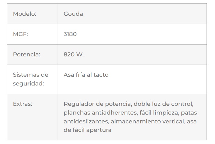 La sandwichera Gouda tiene una potencia máxima de 820 W. Cuenta con planchas antiadherentes y capacidad para 2 sándwiches.