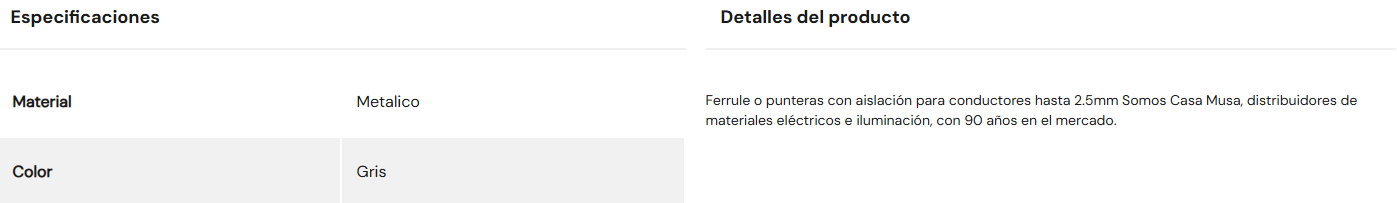 TERMINAL FERRUL 2.5MM GRIS (BOLSA 100) MUSA Stock por sucursal Stock por sucursal $ 1.750 cantidad Agregar al carro Avísame cuando llegue